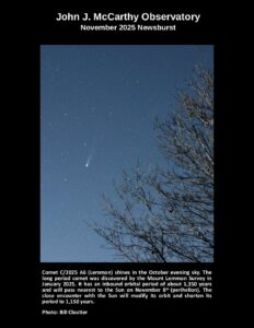 The McCarthy Observatory publishes a monthly newsletter called The Galactic Observer. The newsletter includes interesting space-related news, feature stories, current events at JJMO, and a calendar of both upcoming and historical space milestones.
