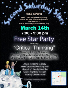 Join us for our open to the public star party on the Second Saturday of every month! No reservations required and admission is always free. Each month a new presentation is given on an astronomy related topic. If weather permits, a variety of telescopes are available for public viewing of seasonal celestial objects. The observatory, which is ADA compliant, may also host special viewing events when possible for rare or interesting astronomical phenomena such as eclipses and transits. There is ample parking at the front of the building. Donations are gratefully accepted.